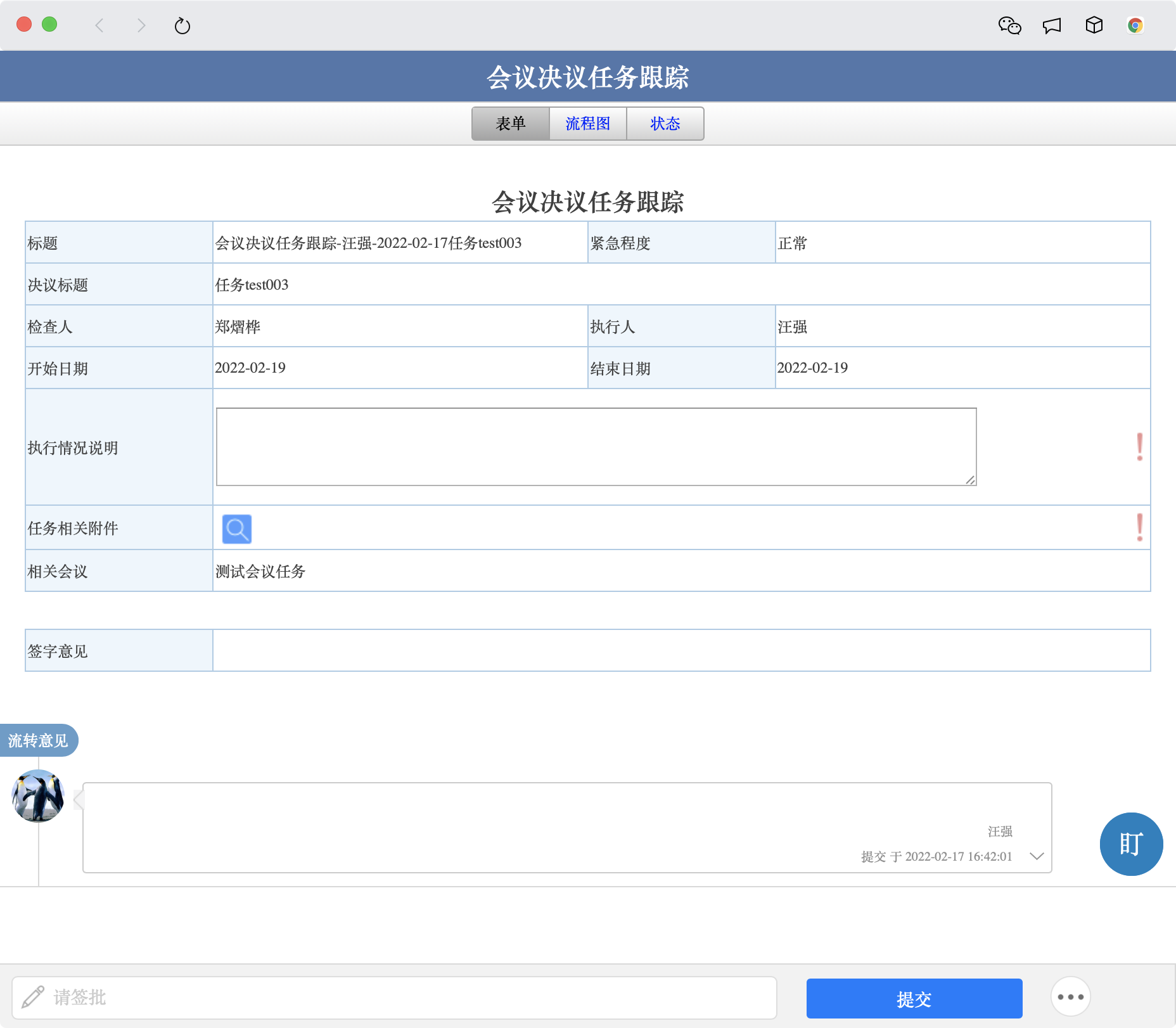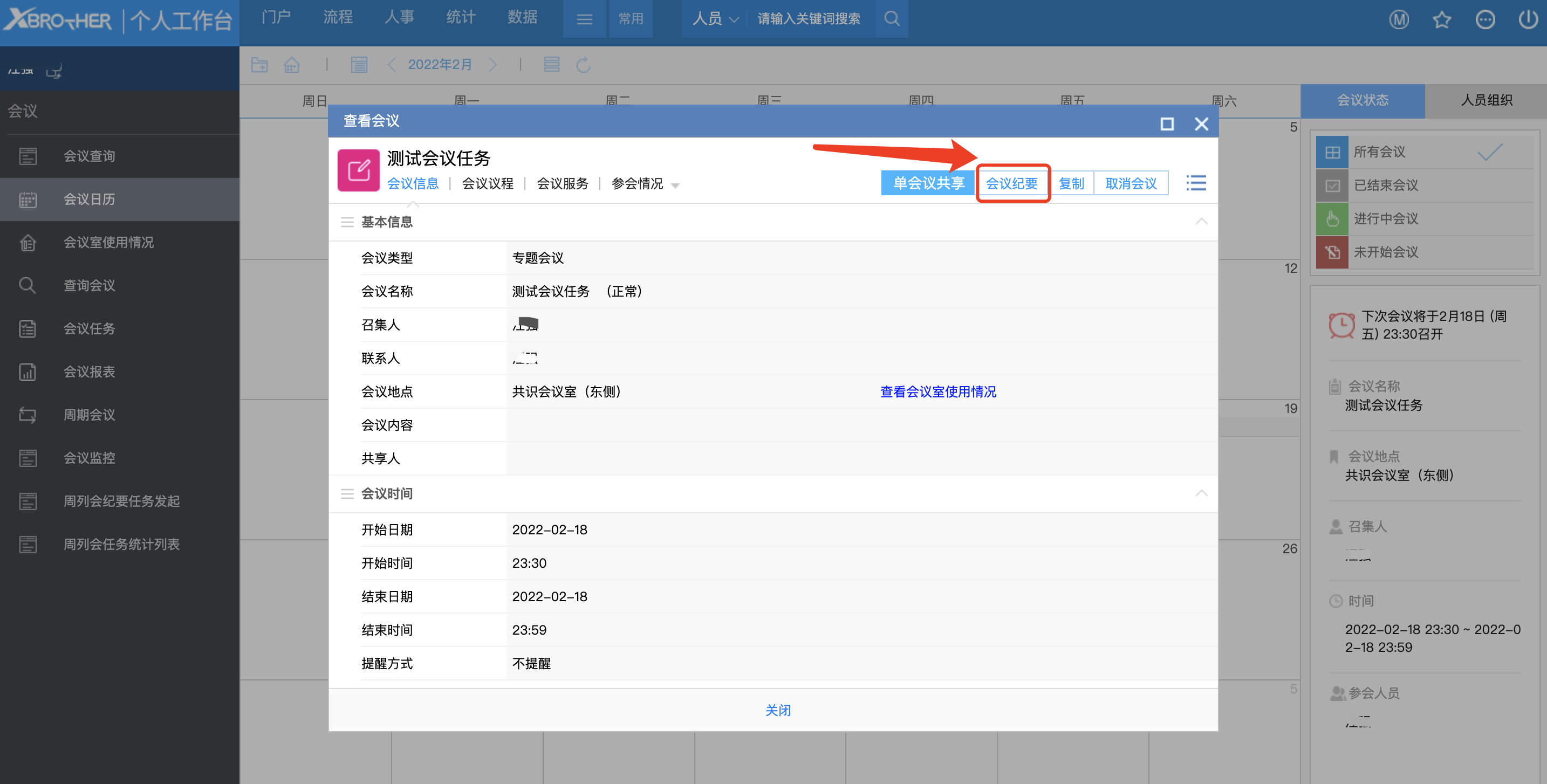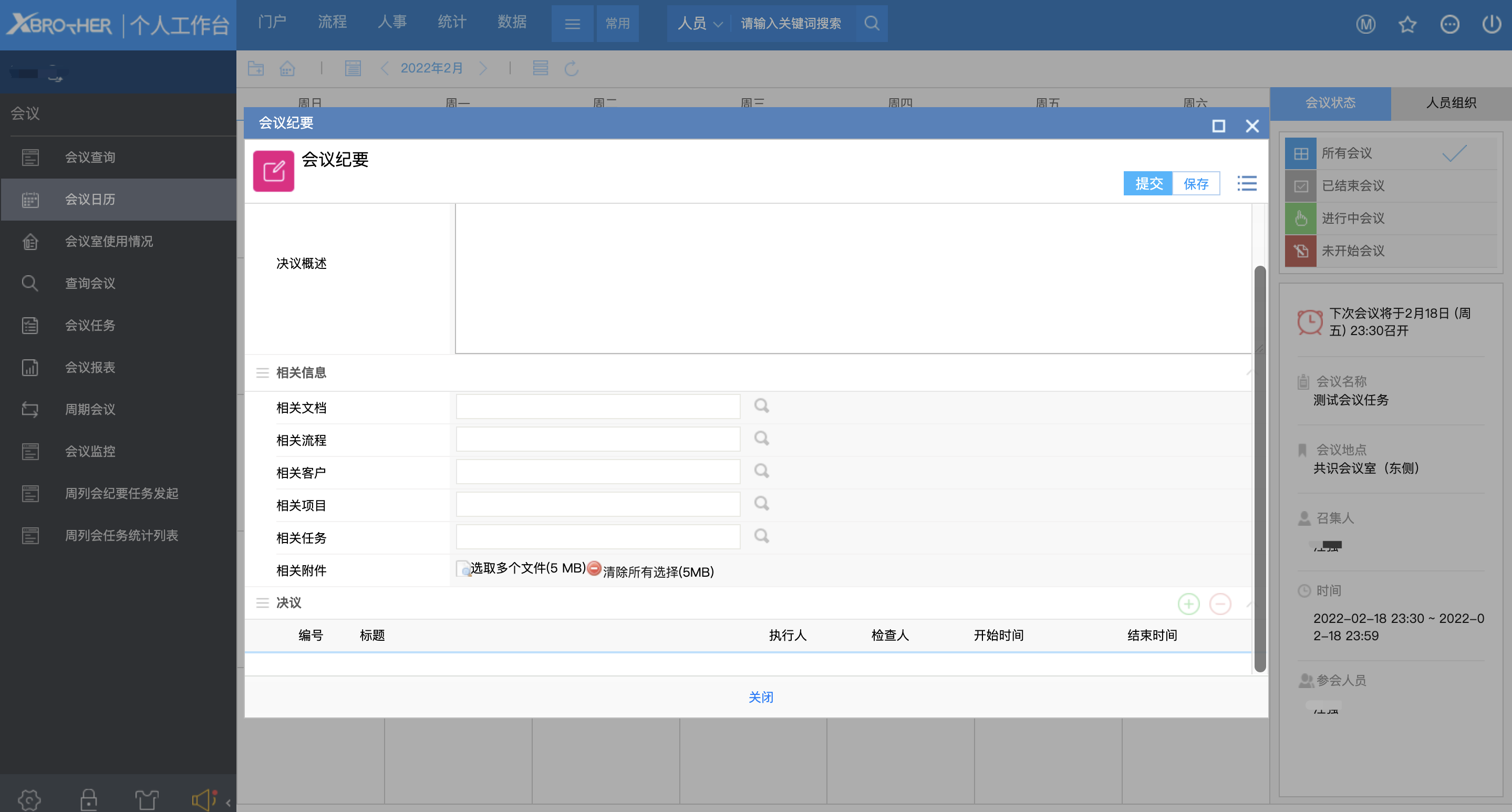 > 提供一个会议任务跟踪功能。 # 一、添加会议任务 ### 1.1 预定会议室 可参考文档预定会议:http://oa.xbrother.com:8890/project-20/doc-101/ ### 1.2 打开查看会议页面 可通过如下方式打开,任选其一 1)点击“会议查询”菜单,在页面中找到相关会议点击会议名称,即可弹出查看会议页面。如下图1所示  图1 2)点击“会议日历”菜单,在页面中找到会议时段,通过点击会议名称,即可弹出查看会议页面。如下图2所示  图2 ### 1.3 添加会议纪要 打开1.2中的弹出页面后,点击右上角“会议纪要”按钮(如图3所示),进入编辑页面(如图4所示)  图3  图4 点击右下角“”,添加任务,可同时添加多条任务,如图5所示。添加完成后,点击右上角“提交”按钮即可。 相关字段说明: - 编号:自动生成序号。 - 标题:必填项,任务标题。 - 执行人:需完成任务的责任人。(执行人会收到会议决议任务跟踪流程提醒,同时需提交流程,提交后流向检查人确认) - 检查人:审核任务执行情况。(具体可参考二中2.2说明) - 开始时间:任务开始时间。 - 结束时间:任务结束时间。  图5 # 二、任务提醒、执行、检查说明 ### 2.1 提醒、执行 任务发起后,执行人会收到任务相关的代办流程(PC网页端及企业微信会同时收到),如图6所示  图6 点击打开提醒流程后,进入详情页面,如图7所示。责任人完成任务后需提交此流程,同时会流向检查人审核。  图7 ### 2.2 检查 执行人提交流程后,检查人会收到一条流程消息,打开后如图8所示,需确认任务是否完成。 确认完成时,点击“提交”按钮;确认未完成时,点击“退回”按钮。  图8 # 三、任务列表 路径: 会议-->会议任务 如图9所示:  图9 点击右侧“”按钮,可完成任务(功能同2.1)。
