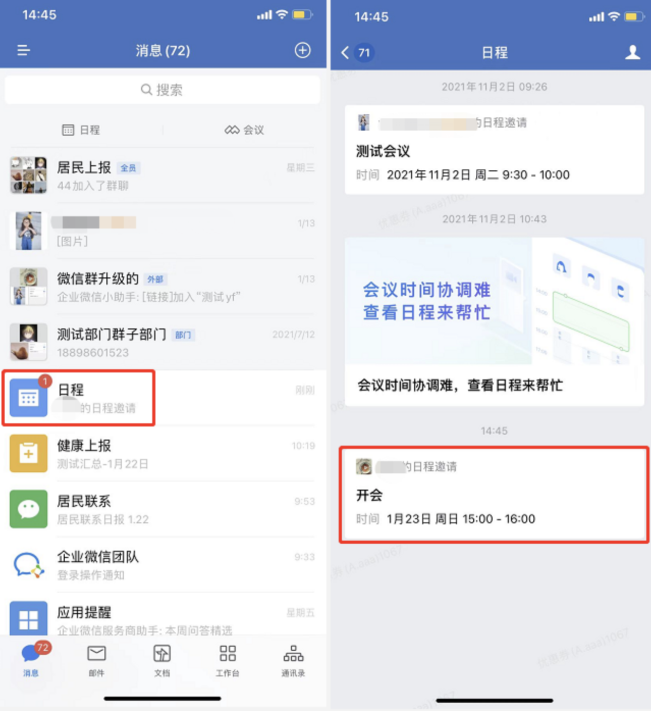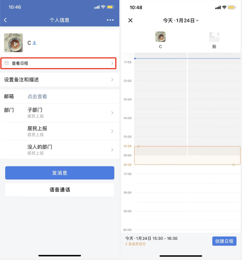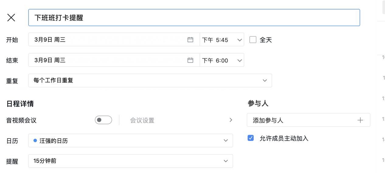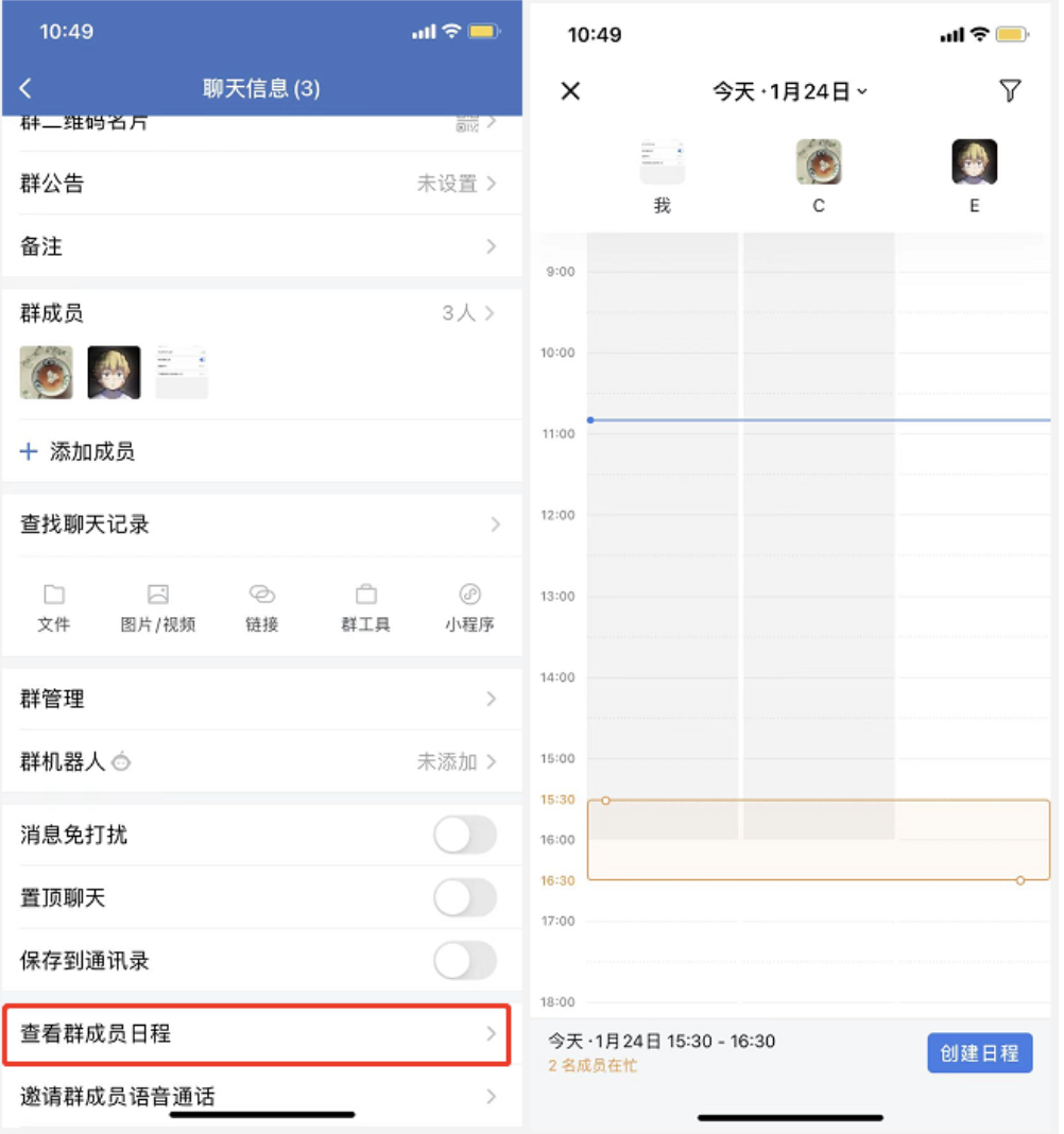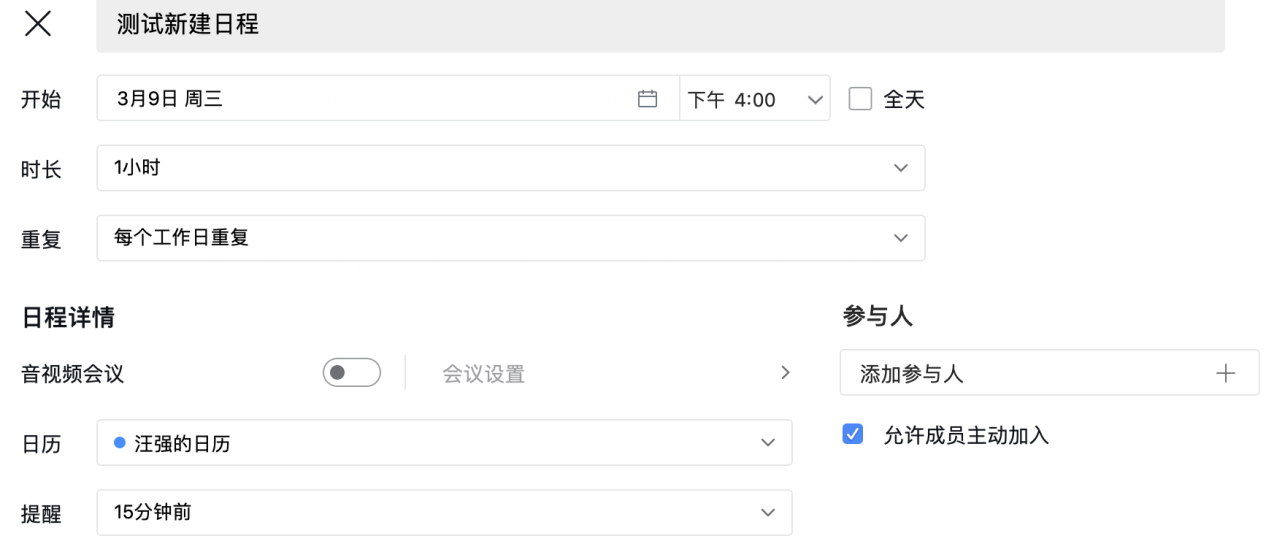 # 日程、代办、置顶相关说明 # 添加到日程 当收到一条消息来不及处理时,可以长按这条消息->选择“日程”(PC为“添加到日程”),添加日程。 ## 查看日程参与人闲忙 目前有三种方式可以查看成员日程闲忙状态。 1. 新建日程-选择参与人,点击「安排时间」后,可以查看参与人闲忙。  1. 点击个人信息页-查看日程,可以点击自己和对方的日程闲忙。  1. 点击群后信息页-查看群成员日程,可以查看群内成员的闲忙状态,找到成员共同的空闲时间,快捷创建日程。  ## 新建日程 PC端点击日程,进入新建页面(移动端点击日程后点击右上角“+”号或者底部新建日程快捷键),以PC为列说明。  相关说明: * + 1. **开始** 选择日程开始日期及具体开始时间。可选择全天,此时无需填写时长,但需确定结束日期。 * + 1. **时长** 日程持续时间,默认提供30分钟/1小时/2小时/3小时选择项供选择,也可自定义结束时间。 * + 1. **重复** 如周期性工作,可采用此设置,默认提供不重复/每天重复/工作日重复/每周重复/每两周重复/每月重复/每年重复等选择项,也可自定义重复规则。 如图设置,代表每个工作日下午4点到5点都存在日程。  * + 1. **提醒** 日程开始前提醒,提供日程开始时/5分钟前/15分钟前/1小时前/1天前等选择项选择,同时也可选择不提醒。 * + 1. **附件** 新建时可添加相关附件,附件可从本地选择,也可从微文档/微盘选择。 * + 1. **参与人** 可选择企业内同事参与,共享日程,添加后其日程面板里也会显示。 * + 1. **允许成员主动加入** 勾选后代表其他人可主动参与,可分享日程给他人,打开后点击接受即可加入。 ## 日程提醒 1. 组织人创建日程后,其他参与人将收到日程卡片提醒。  1. 日程信息(主题、时间、地点)修改后,日程应用推送日程卡片,提醒参与人关注信息变更。  1. 日程开始前,参与人将收到日程的自动弹窗提醒,避免错过会议。  ## 应用实列 建立日程提醒上下班打卡。 如图所示上班打卡提醒设置   其中重点为设置每个工作日重复及15分钟前提醒。 # 添加到代办 ### 添加到代办 当收到一条消息来不及处理时,可以长按这条消息->选择“待办”(PC端为“添加到代办”),添加提醒。在设置待办的页面,可以设置待办提醒时间以及添加待办参与人,添加完待办后,你和参与人将会收到一条系统提醒消息,同时在【待办】里查看到该提醒。  ### PC端查看代办 路径:日程--代办  ### 移动端查看代办 路径:日程--代办   # 置顶 1. 在多人聊天时,可以长按某一条消息气泡,选择“置顶”,即可把当前消息置顶到群聊窗口顶部,方便群聊成员查看,避免遗漏。 2. 群聊成员可以移除消息置顶,不影响其他成员查看。 3. 置顶创建者移除,会将所有群成员的消息置顶移除。 4. 消息置顶不会自动过期,每个群聊同一时间内只能展示一条消息置顶。