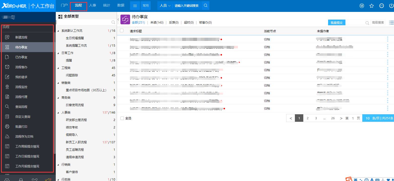 # 流程模块前端说明 ### 一、概述 流程模块用于用户处理与流程有关的事宜,通过不同的菜单可以处理流程、发起流程、跟踪流程、打印流程等。 ### 二、说明 如图1所示,前端流程模块包括待办事宜、新建流程、已办事宜、流程督办、我的请求、流程代理、批量打印、流程监控、查询流程和流程存为文档等10个主要菜单:  图1