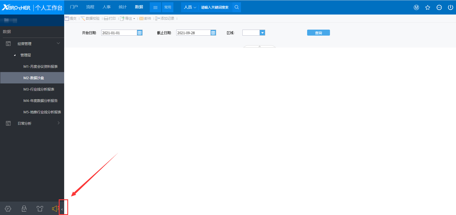 # 一、路径 模块区-->数据 如图1所示:  图1 # 二、基本操作 **1、收缩左侧菜单栏区域** 点击左下角<按钮即可,如图2所示,收缩后效果如图3所示,点击>按钮,可展开左侧菜单区域  图2  图3 **2、收缩报表查询条件区域** 点击按钮,如图4所示;收缩后效果如图5,点击可展开条件区域。  图4  图5 **3、数据导出** 点击顶部按钮,可以导出PDF、Excel、World、图片等格式的文件  # 三、其他情况说明 1、若出现"单点登录失败请联系系统管理员!"的弹出框提示,如下图所示:  > 解决办法: 导致此问题的原因,一般是近期修改过OA系统密码,密码还未同步到报表模块。 可通过如下方式解决: ① 等待1小时候尝试。 ② 联系ERP部处理。 2、若点击菜单后,出现空白页面,如下图所示:  > 解决办法:先尝试重新点击菜单看是否正常,若仍然空白,建议更换浏览器。 IE浏览器出现此种情况较多,建议更换现代浏览器,如google、Firefox等。