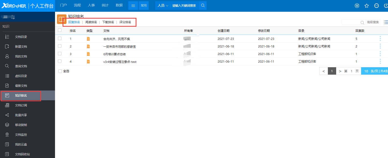# 一、概述 知识排名是从回复数量、被阅数量、下载数量、评分总数四个方面来对系统中的文档进行一个统计,通过这里可以大概了解一下系统中用户人气最高的文档有哪些,哪些文档是最受欢迎的。 # 二、知识排名页面 点击【知识排名】菜单后显示如图1所示,需要说明的是,这个排名每个人看到的不一样,这是因为这里只显示你能看到的文档排名,你不能查看的文档不在此统计。  图1 - 回复排名:根据文档又多少回复数进行排名,回复最多的文档排在前面; - 阅读排名:根据文档的被阅读次数进行排名,被阅读次数最多的文档排在前面; - 下载排名:根据文档附件的下载次数进行排名,如果一篇文档有4个附件,全部下载后此文档的下载次数就记录为4次,所以下载排名是根据文档来进行统计的,而不是具体的附件; - 评分排名:根据文档的打分情况进行排名,平均分数越高的文档排在最前面。