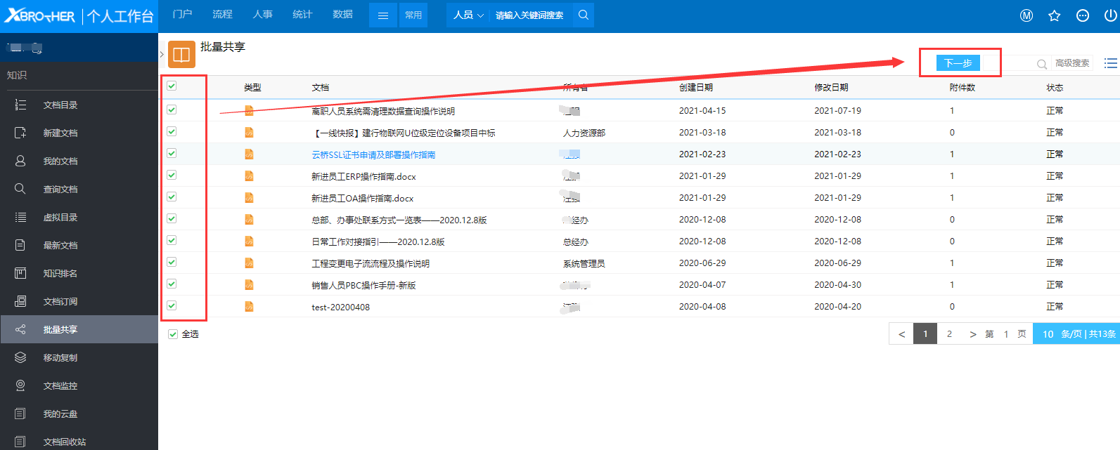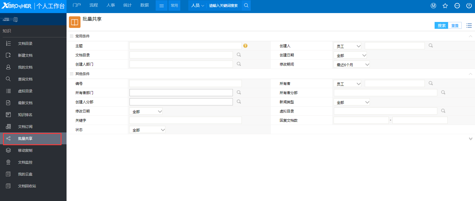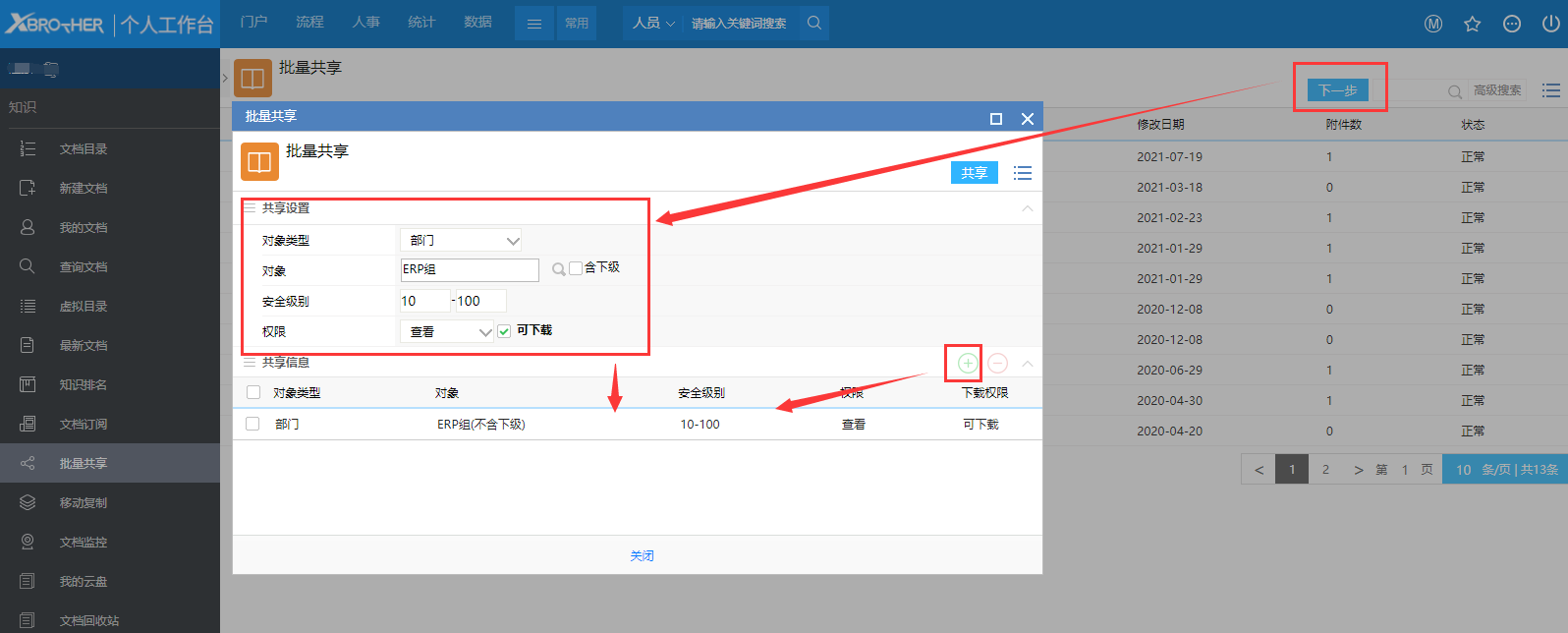 # 一、概述 每篇文档都可以单独设置共享,当有新的员工入职、人事或组织机构发生了变动,需要查看一批原来无法查的文档,就需要用到这里的批量共享功能了。 # 二、批量共享操作 1、点击【批量共享】按钮之后,显示如图1所示,展示的不是文档列表,而是搜索条件,也就是说必须先将你需要共享的文档通过搜索条件找出来,然后再添加共享。  图1 2、在搜索结果中找到需要共享的文档并选中,再点击【下一步】按钮,如图2所示  图2 3、在知识共享页面,添加共享对象和共享级别就好了,需要注意的是,选好共享对象和共享级别后必须点击这个添加按钮,显示在下方的列表中再保存,否则等于没有添加共享,如图3所示。  图3 4、最后一定要点击右上角的【共享】按钮,才算完成批量共享的操作。