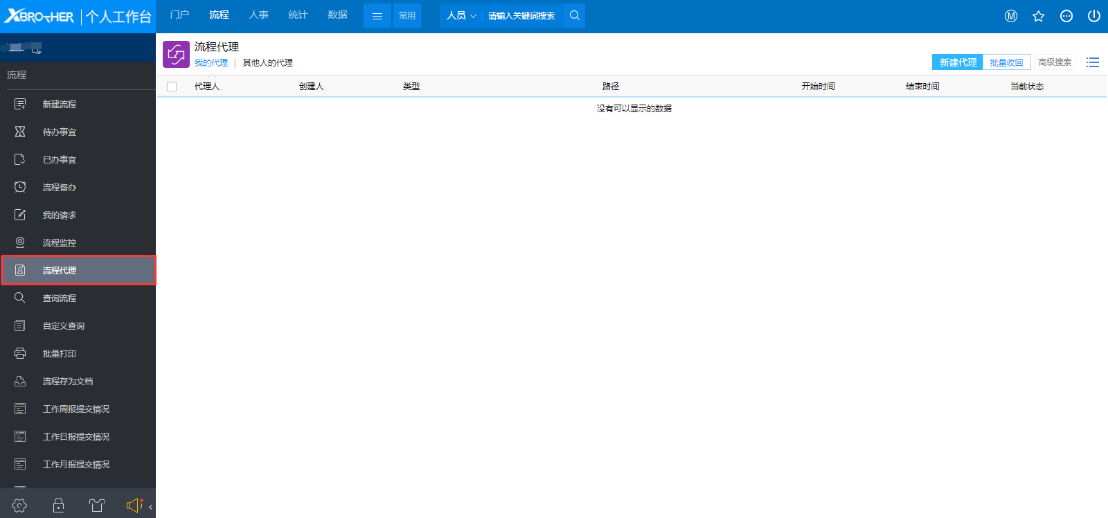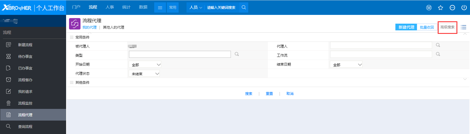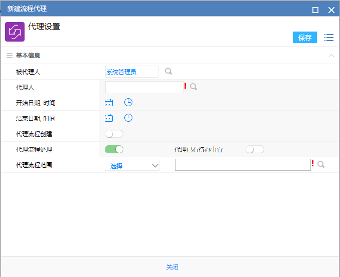 ### 一、概述 用户可能由于出差在外不方便处理流程时,可以通过流程代理将流程在指定的时间范围内交给其他同事处理。在流程有效期结束后会自动收回流程代理,如果被代理人希望提前收回代理,则可执行立即收回的操作。如果有收回流程代理的权限,那么也可以为其他人收回流程代理。 ### 二、功能说明 点击前端应用中心菜单【流程】--【流程代理】,打开如图1所示的页面:  图1 - 【我的代理】标签页显示了当前用户代理给其他人的代理设置。 - 【其他人的代理】标签页显示了其他人代理给自己或别人的代理设置。 - 点击【高级搜索】展开高级搜索条件,可对列表中的代理记录进行过滤查询,如图2所示:  图2 ### 三、新建代理 1、在图1所示页面中点击右上角【新建代理】按钮,打开如图3所示操作窗口:  图3 - 被代理人默认为当前操作的用户,如果拥有系统管理权限的话,可以选择其他用户,否则这个字段是不可编辑的; - 代理人是选择你要将你的流程交给谁操作,这里只能单选; - 开始日期时间是用来设置从什么时间开始代理关系,只有设定时间之后到达的流程才会流转到代理人那里,所以这个时间是很重要的,这样也是为了方便用户提前设置好代理关系以免人离开了无法操作系统,如果这里不设置开始时间的话代理关系立刻生效; - 结束日期时间是用来设置从什么时间之后代理关系无效,即设定的结束时间之后到达的流程将不会流转到代理人那里,这里如果不设置内容的话那么代理关系就不会结束; - 代理已有待办事宜是指代理关系生效时,将用户待办事宜中的流程代理出去,如果不开启那么待办事宜中的流程仍然在被代理人这里,只有新到的流程才会流转给代理人; - 代理流程范围是指将哪些流程代理出去,默认为全部,可以切换选择某些流程,可以将不同的流程在同一时间内代理给不同的人处理。 2、==需要特别说明的是代理关系不能重复代理== - 不能在同一时间将同一个流程代理给2个用户; - 不能将代理的流程再次代理给其他用户,即A用户将流程代理给了B用户,B用户只能将自己的流程代理给C用户,而不能将代理A处理的流程再次代理给C用户。 ### 四、收回代理 鼠标覆上列表行显示的操作选项有【收回此条代理】和【收回全部代理】: - 点击【收回此条代理】,弹出提示如图5所示,默认勾选“收回流转中的流程代理”:  图5 - 点击【收回全部代理】,弹出提示如图6所示,可收回此条流程所属路径下的所有流程,默认勾选上“收回流转中的流程代理”:  图6