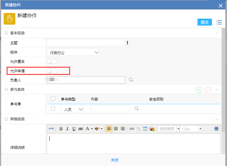 # 一、概述 在协作基本信息中设置为允许申请,原本无权限的人员想查看并参与到此协作时,可申请此协作,负责人同意后便可参与到此协作交流中。 # 二、设置与申请 如图1所示,主题负责人必需将主题的“允许申请”开关打开,其他用户如果不是此主题的参与者,才能在“协作申请”中看到这个主题,如果对主题的内容感兴趣的话,可以申请加入这个主题的讨论,如图2所示。  图1  图2