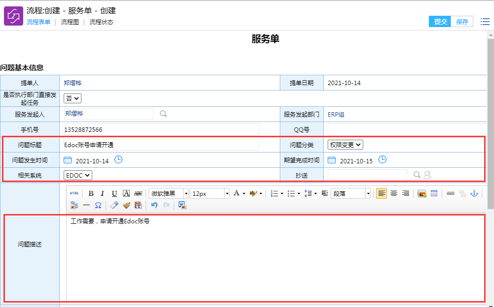 **EDOC账号开通申请** OA → 新建流程 → 服务单,申请EDOC账号开通  服务单填写内容可参考如下截图