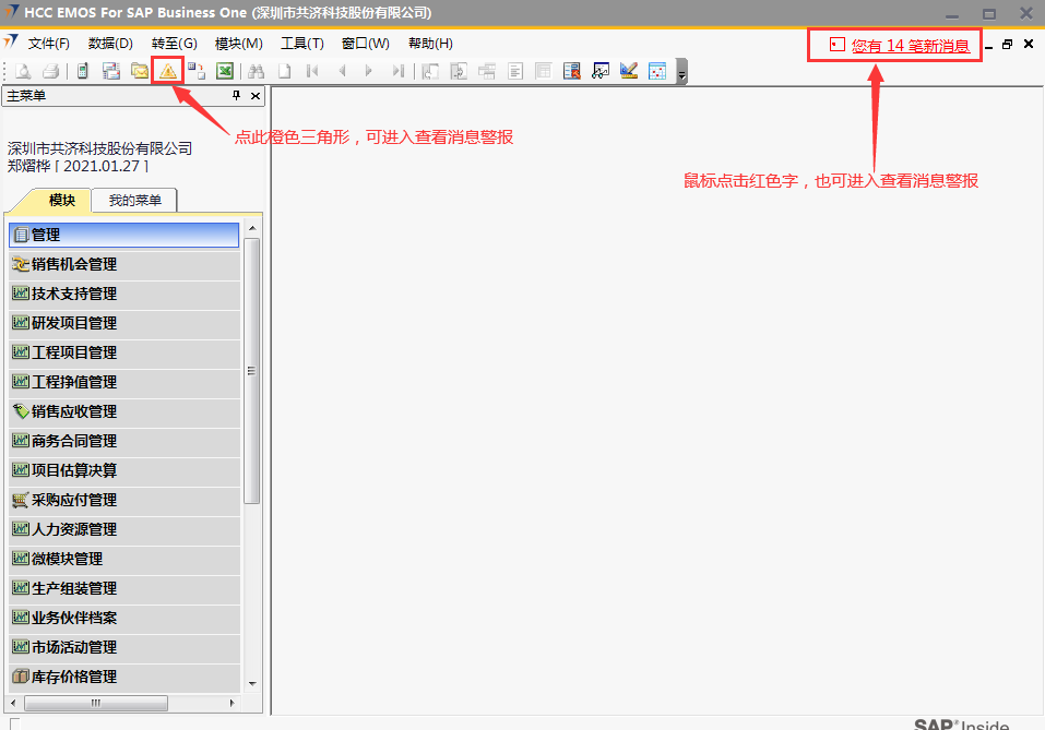 点工具栏,可查看消息警报 或点“您有X笔新消息”,也可查看消息警报  如下为效果图,请及时查看和留意警报 、审批及短消息内容
