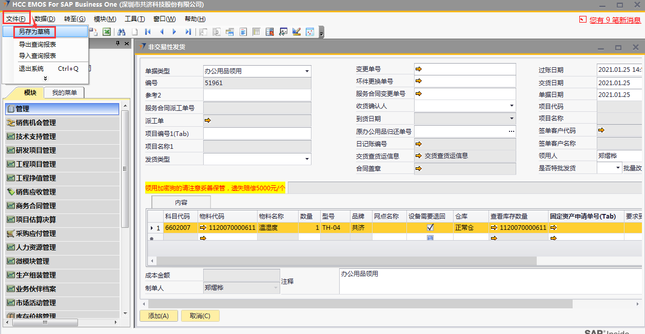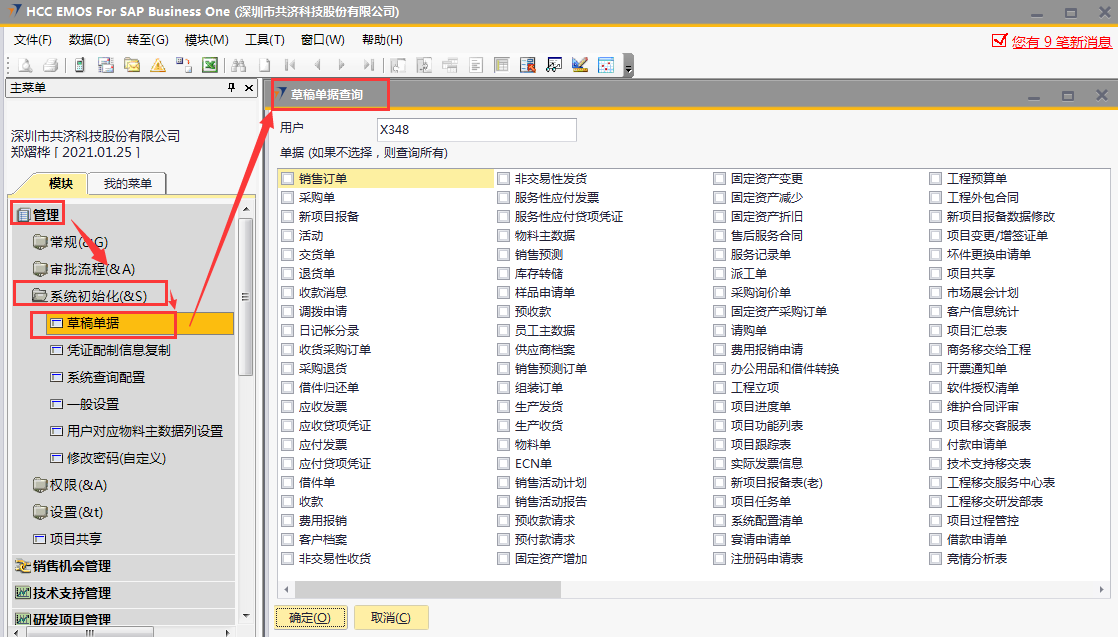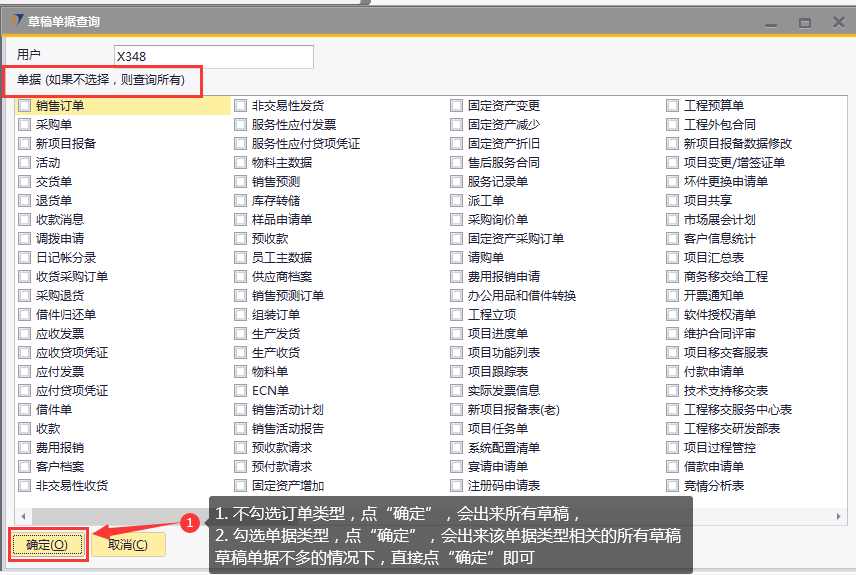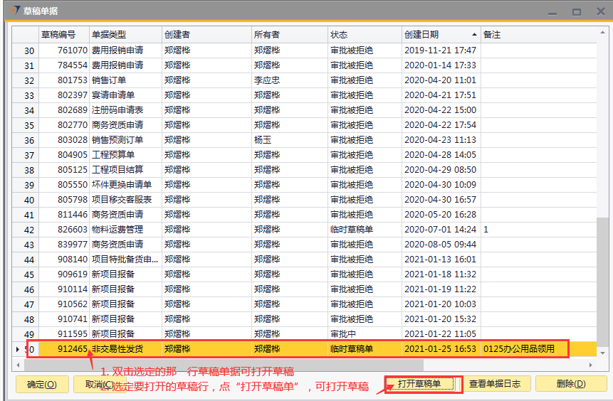 ## 1.1 保存草稿 单据如果不需要马上添加或不能直接添加,需要先保存草稿时,可另存为草稿 路径:文件 → 另存为草稿  会弹出来如下**草稿备注**对话框,录入草稿备注,点“确定”即可  ## 1.2 草稿查询 路径:管理 → 系统初始化 → 草稿单据  如果不选择单据,查询所有单据草稿;如果选择单据,查询该单据相关的草稿 草稿单不多的情况下,可不选单据直接查找  选中要打开的草稿单 双击选定的那一行,可打开草稿单;或点右下方**打开草稿单**,可打开草稿单