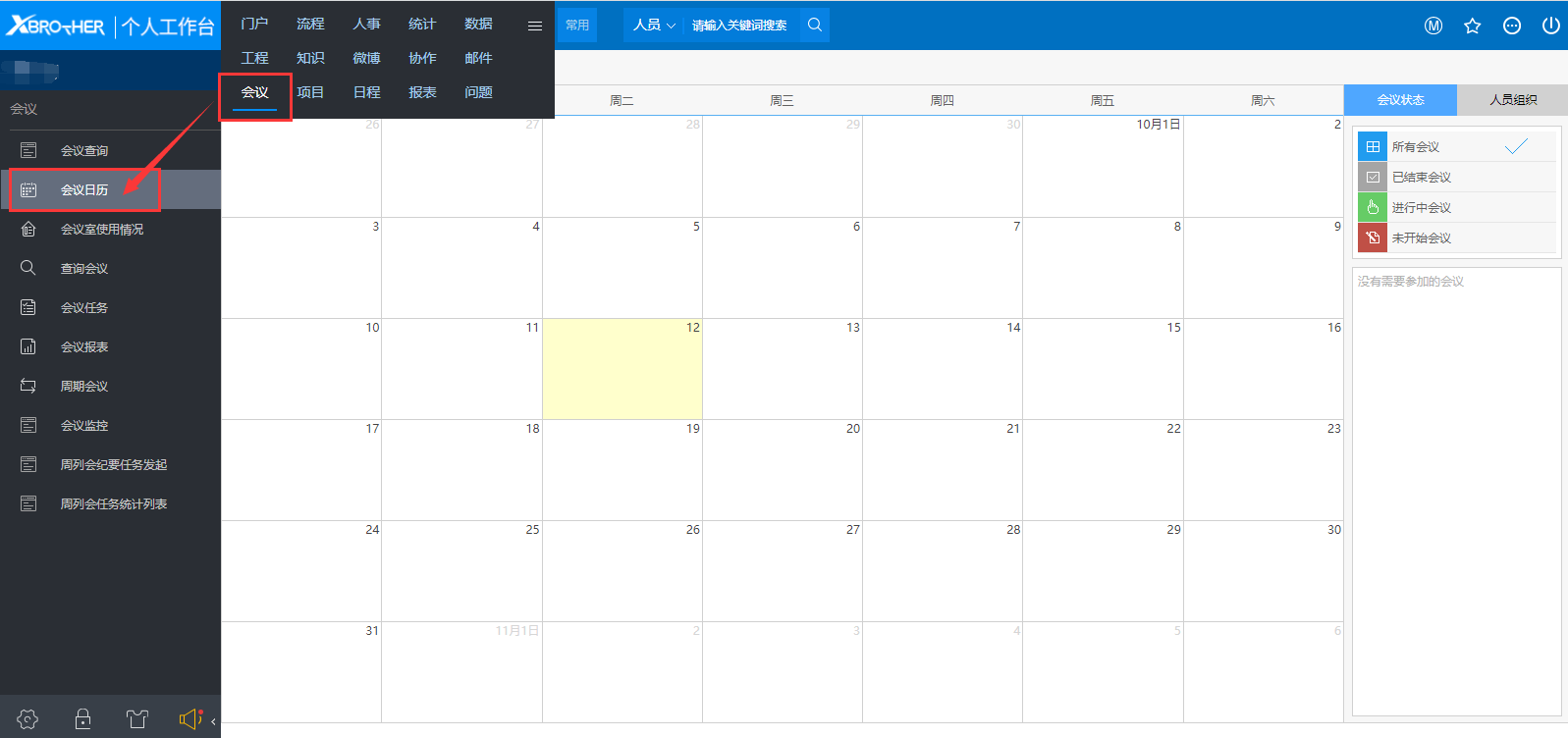 # 一、路径: 会议-->会议日历  详细操作可参考: http://oa.xbrother.com:8890/project-20/doc-101/